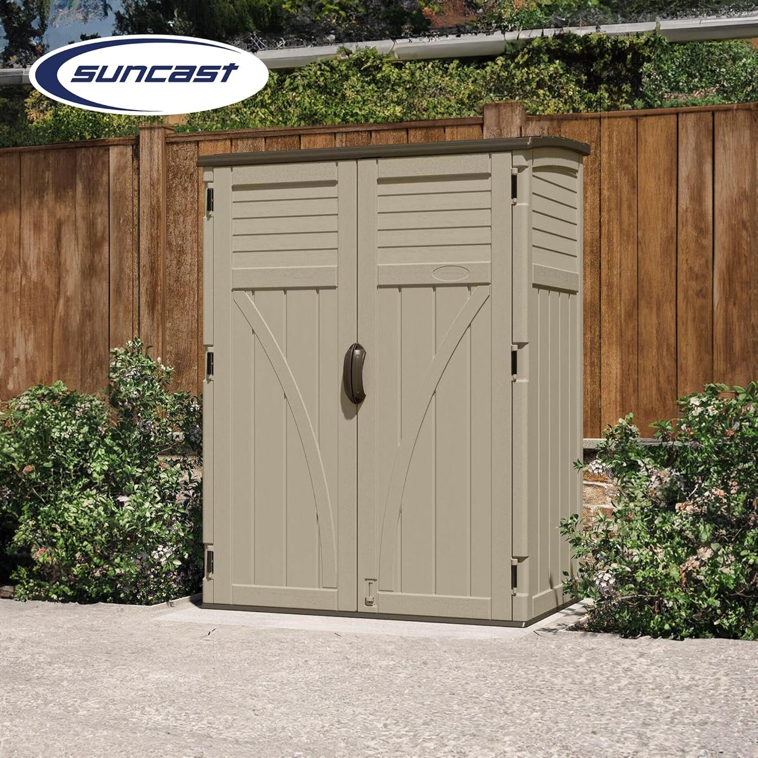 The Suncast Outdoor Storage Shed is a durable, weather-resistant vertical cabinet that keeps your patio, garden tools, and equipment secure in any season. Made in the USA, this shed features a lockable resin design that resists rust, rot, and warping, offering 54 cu. ft. of customizable storage, perfect for bulky or long-handled items. Its sleek, modern look blends seamlessly with outdoor spaces, making it an ideal solution for clutter-free organization. Upgrade your outdoor area with reliable and stylish storage from Suncast.