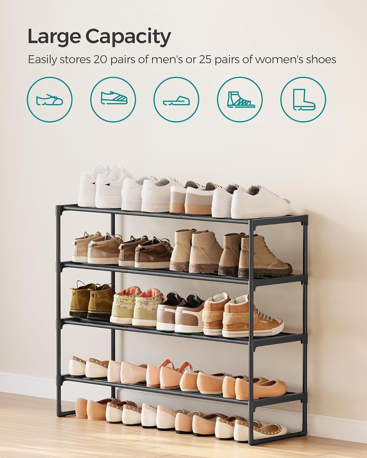 • High Capacity: Holds between 20 and 25 pairs of shoes thanks to a multi tier rack layout—perfect for optimizing closet organization.